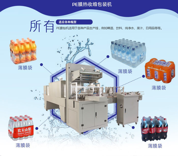 PE膜包裝機(jī)適用于包裝易拉罐、瓶子,同時適用于有無瓶底托兩種情況。主要工作在收縮通道中進(jìn)行。此設(shè)備采用德國優(yōu)良技術(shù)和國際知名品牌部件,產(chǎn)量穩(wěn)定、使用壽命長久。