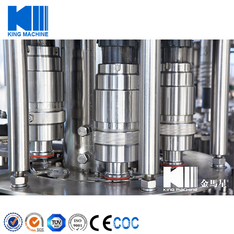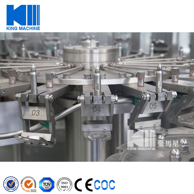 飲用水灌裝機集沖洗、灌裝、旋蓋于一體,全過程自動化運行,主要適用礦泉水、純凈水等不含氣飲料的沖瓶、灌裝、封口連續(xù)作業(yè)。本機大部分電器系統(tǒng)零件均采用國外優(yōu)良產(chǎn)品,所有與液料接觸的地方均采用優(yōu)質(zhì)的不銹鋼材料制作,主關(guān)鍵部件采用數(shù)控機床精密加工, 整機光電檢測各部件的運行狀況,無瓶不灌裝,無瓶不送蓋,自動化程度高,操作簡易,具有耐磨、穩(wěn)定、故障率低等特點,產(chǎn)品質(zhì)量處于行業(yè)前列,是新老飲料投資者的選擇。